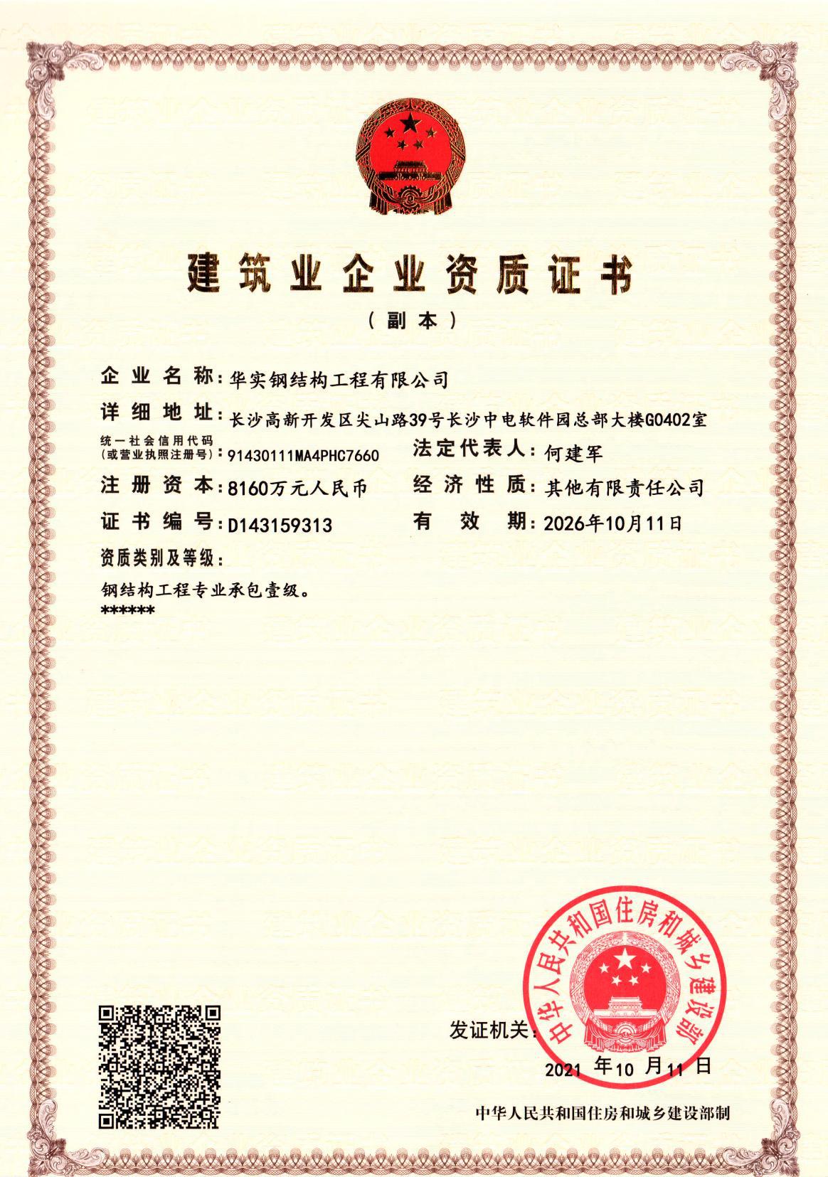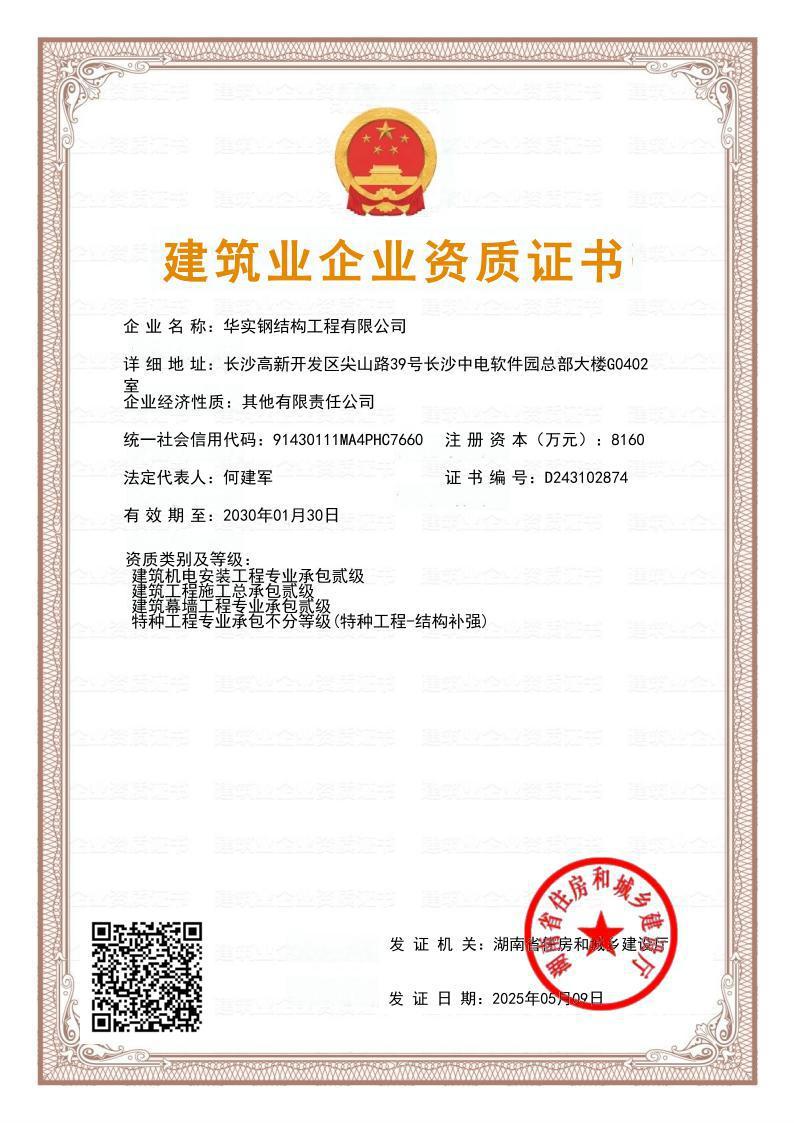 華實鋼結構工程有限公司是華實建設集團有限公司的專業鋼結構子公司,鋼結構工程廠家,公司擁有鋼結構工程專業承包壹級資質、建筑工程施工總承包貳級資質等建筑資質,注冊資金8160萬,公司生產制造基地湖南泰成鋼結構有限公司,坐落于寧鄉市大成橋工業園,自成立以來一直致力于鋼結構產品研發、設計、制造、施工、銷售業務,具備按期保質交付客戶的全流程保障的專業實力,主要業績遍布國內及海外市場。